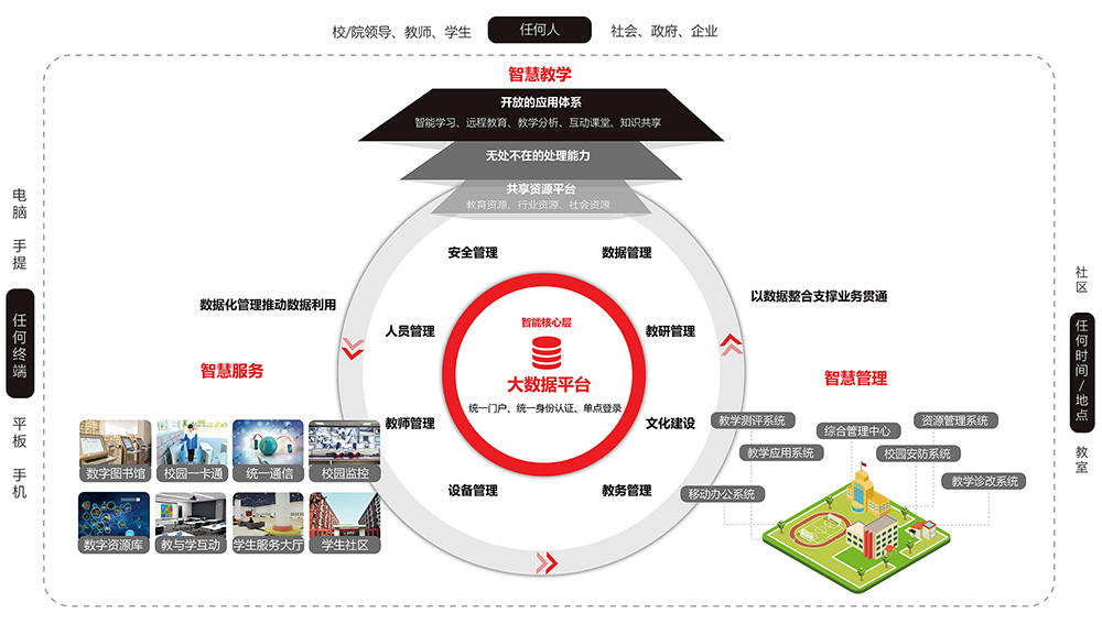 為了全面落實《教育信息化2.0行動計劃》,推進“互聯(lián)網(wǎng)+教育”的具體實施計劃,進一步提升信息化管理服務水平,學校啟動數(shù)字校園建設。通過數(shù)字校園,提供及時、準確、高效、隨時隨地的校園信息化服務,提供滿足跨部門的業(yè)務管理、面向全校用戶便捷的信息服務,實現(xiàn)學校各類資源的整合和配置優(yōu)化,提高學校的管理水平和辦學效率,使我校的教育信息化應用達到較高水平。