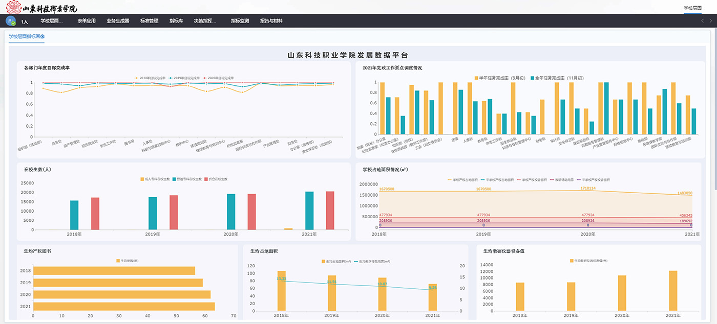 融合學校“智慧校園”頂層設計,對接基礎支撐平臺系統,開發建設基于校內各職能部門、專業、課程、教師、學生診改全流程的內部質量保證體系診斷與改進平臺;建設數據互聯互通、實時共享的大數據平臺,實現對學校、院系、專業、教師、學生五個層面的數據實時分析展示,實時掌握核心數據及診斷人才培養工作狀況,為學校自主診改、人才培養年度質量報告編制提供數據服務支持。