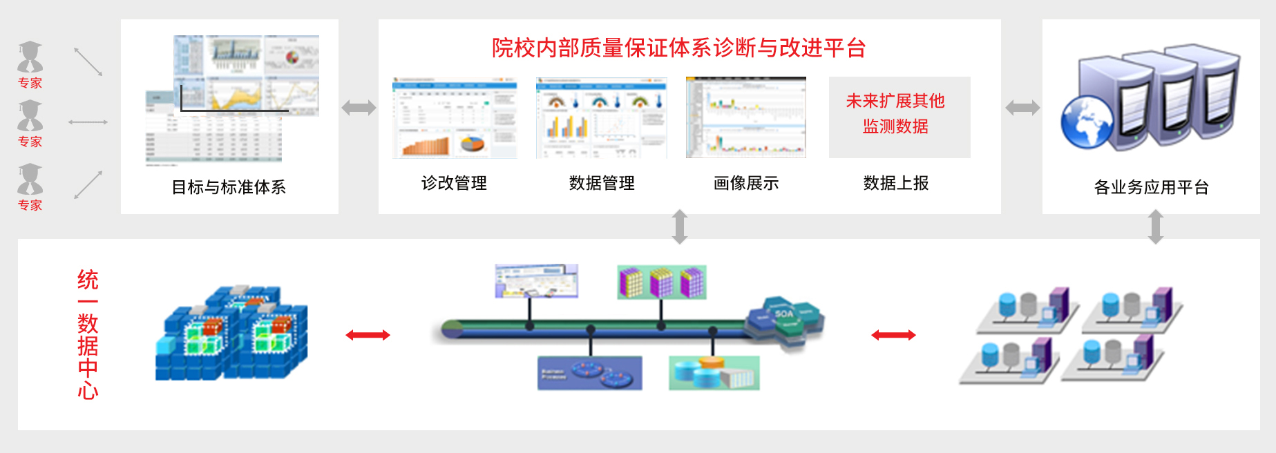 學校要求按照“數據可采集、數據可存儲、目標可設計、指標可對比、維度有畫像、問題有預警、診斷有過程、改進有建議、報告可生成、結果可分析、未來有引導”的診改基本原則,提供多種診斷標準模版,基于“五縱五橫一平臺”與“8字型螺旋質量改進”的理念,支持各層面、各級別的指標與質控點的自定義設計。