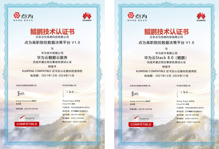 12月30日,經過多維度嚴格驗證,點為旗下的“高職院校數據決策平臺V1.0產品”完成了與華為云Stack8.0的兼容性認證,正式獲得華為鯤鵬計算領域 OpenLab 特予的KUNPENG COMPATIBLE 證書。這標志著點為高職院校數據決策平臺在兼容性、安全性、可靠性以及產品功能性能等方面得到了權威認證。