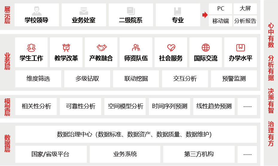 高職院校數據決策平臺是點為公司旗下品牌產品。產品基于院校各部門、辦學全過程的核心管理業務需求設計開發,是集學生工作、教學改革、產教融合、師資隊伍、服務能力、國際交流和辦學水平七大系統于一體的數據決策平臺。產品以實現心中有“數”、分析有“據”、決策有“智”、治理有“方”為宗旨,運用大數據可視化交互式技術,把數據“放出來”、使數據“動起來”、讓數據“用起來”,助力職業院校治理模式從經驗決策向數據驅動轉變,提升決策的科學性和數智化治理水平,實現治理能力與治理水平現代化。