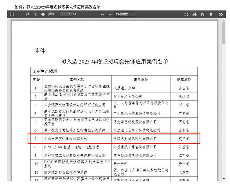 其中,由北京點為信息科技有限公司沈陽技術研發中心(沈陽點為信息科技有限公司)申報的 “礦山生產實訓操作仿真系統” 案例成功入選!